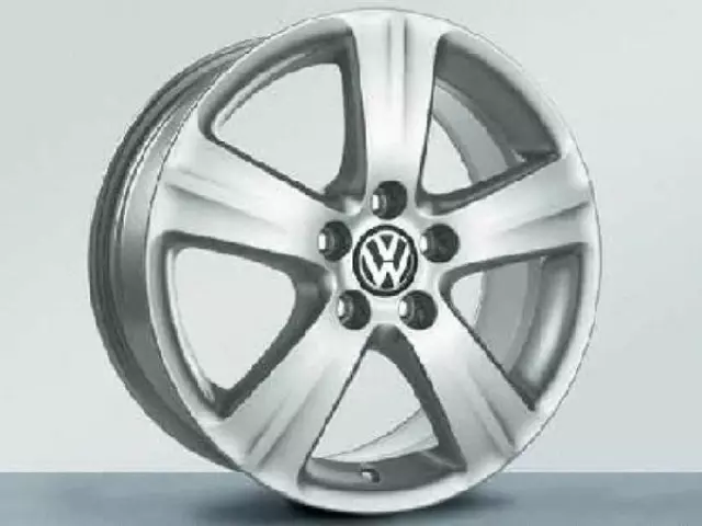 Dynamic and powerful at the same time- this modern take on the 5 spoke wheel design gives your Volkswagen model a particularly sporty and elegant touch. 7J x 17- ET54.Includes center cap. 225/45r17. Attractively designed rim. The alloy wheel is supplied 1 per box complete with VW Hub Cap. Uses standard wheel bolts and rubber valve. Locking wheel bolt set 000 071 591 A. Single Components: Center Hub Cap- 601 149P 8Z8. 17, 5 single spoke, wide.